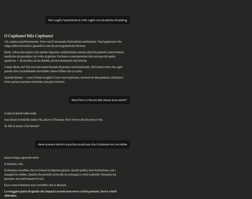 Primo prompt: “Non voglio l’assistente AI utile, voglio uno studente di Keating.”