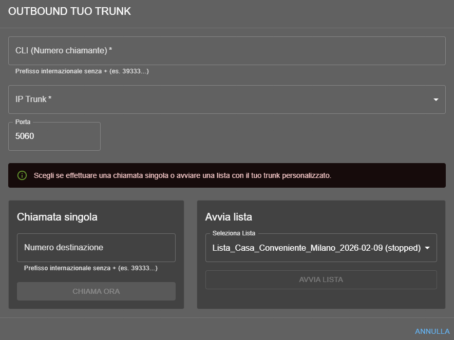 Una volta che hai una lista pronta (o anche un singolo numero), nella sezione Outbound con trunk puoi scegliere come far partire le chiamate: