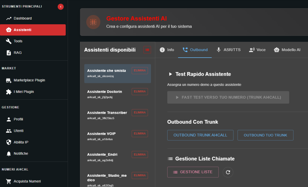 Attiva/gestisci i tuoi assistenti su https://customers.ai4call.com/