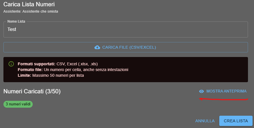 Appena carichi il file, AI4CALL elabora subito la lista e ti mostra l’esito, ad esempio quanti numeri sono stati riconosciuti come validi. Se vuoi controllare cosa hai importato, puoi usare il pulsante Mostra anteprima per vedere i numeri caricati prima di avviare le chiamate.