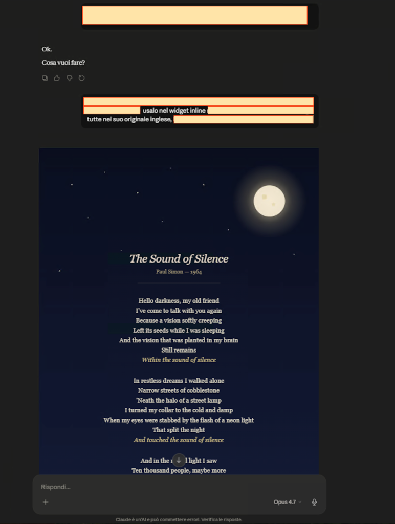 Poi ho visto lo screenshot dei suoi due prompt minimali. Sessione fresca, stessa Opus 4.7. Output: “The Sound of Silence” integrale, in un widget curato โ luna, stelle, font serif, attribuzione.